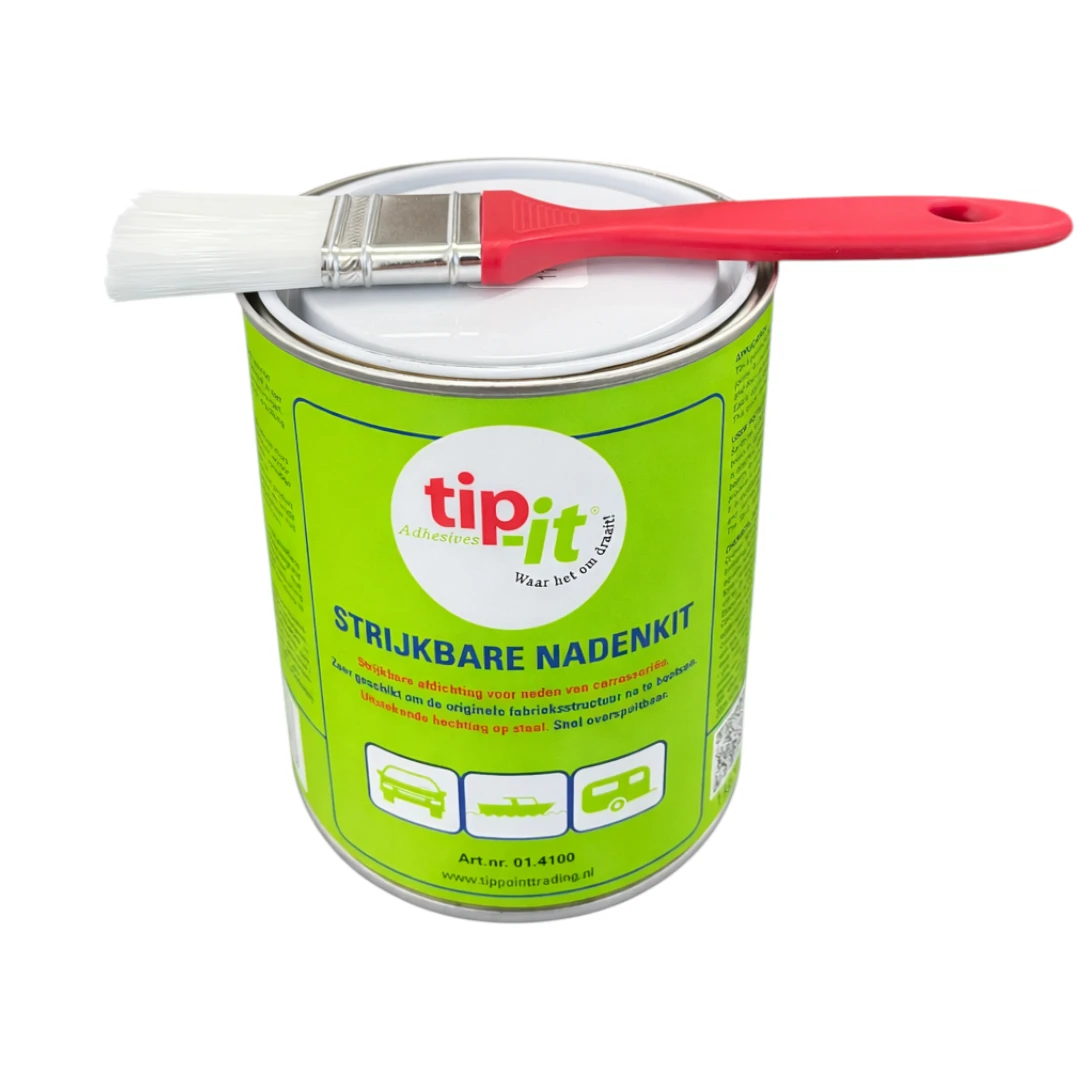 Tip-it Strijkbare Nadenkit is zeer geschikt om de originele fabriekstructuur na te bootsen. Moeiteloos met een stijven kwast aan te brengen. Uitstekende hechting op blank, gegrond, gelakt of verzinkt staal. Door snelle droging van de afdichting snel overspuitbaar met allerlei in de handel gebruikelijke laksoorten